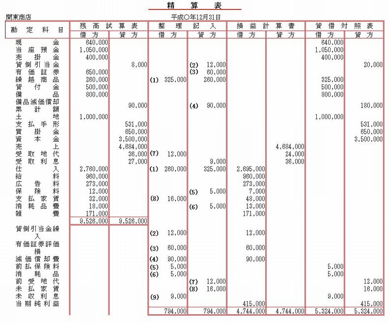 以上の決算整理仕訳を、精算表の整理記入欄に記入し、精算表を作成する。