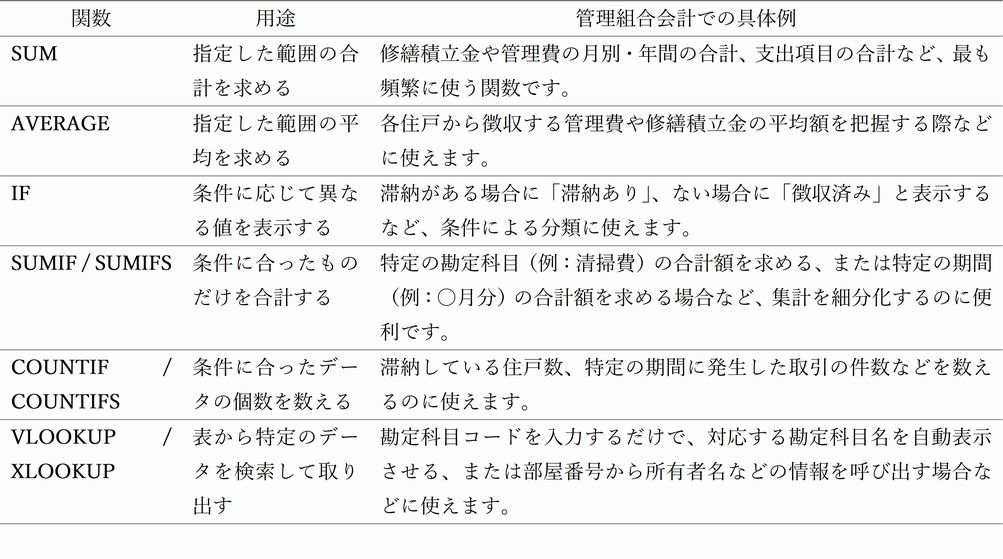 マンション管理組合の会計業務は、これらの関数をマスターすれば、手作業でのミスが減り、報告資料の作成時間も大幅に短縮できます。