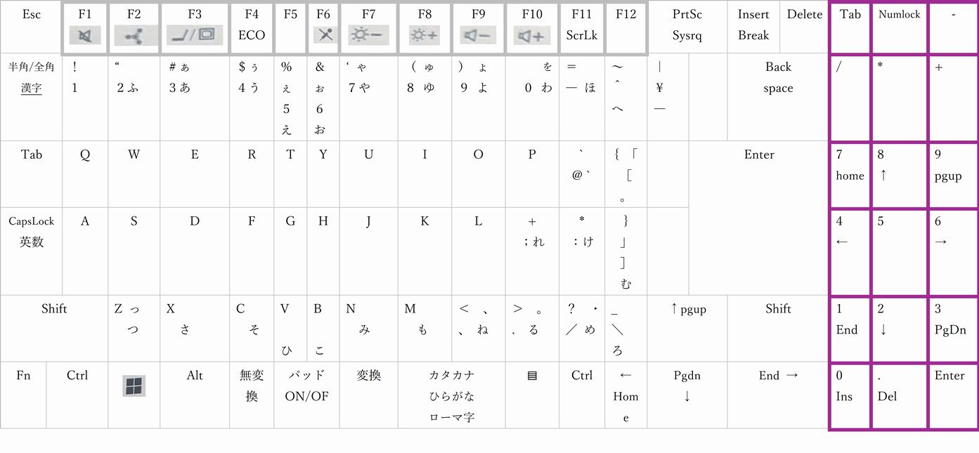 さて、ここからはちょっとした私の「暇つぶしパソコン作業」の話です。私の愛用しているNECのLAVIEノートパソコン(テンキー付の白いモデル)のキーボードを今日はWordを使ってそのキーボードの図を自作してみました。