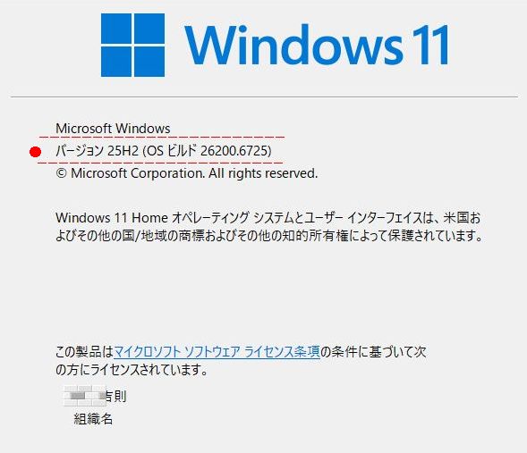 ・タスクバーの検索欄に「winver」と入力し、実行してみると、バージョン「25H2」としっかり表示されている。画像のとおりです。