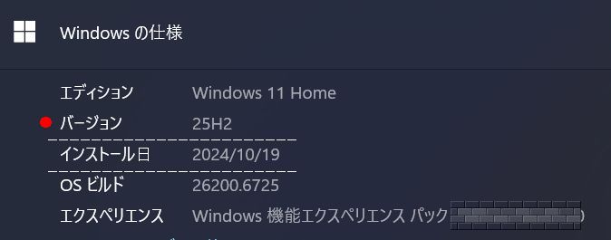25H2へのアップグレードを無事に完了し、「よし、これで最新だ!」とウキウキしながら、念のために、Windowsの仕様を確認してみました。